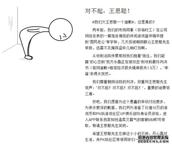备受关注的“王思聪告H5游戏《思聪的日子》侵权案件”近日有了新的进展。因认为自己公司并未侵犯王思聪姓名权,不服一审判决的深圳市鱼丸互动科技有限公司(下称“鱼丸互动”)将北京普思投资有限公司董事长王思聪诉至法院,日前,北京市第三中级人民法院受理此案并维持一审判决。 ![]() 据了解,发现手机游戏《思聪的日子》及该游戏宣传推广文章擅自使用自己姓名从事经营、丑化自身形象,侵犯名誉权,王思聪将深圳市鱼丸互动科技有限公司(简称鱼丸互动)诉至朝阳法院,要求停止侵权、赔礼道歉,并索赔各项损失65万余元。据此,北京市朝阳法院受理此案并公开庭审。 被告鱼丸互动诉称并未侵犯王思聪名誉,加上游戏并没有在社会产生较大影响并于2015年7月退出手游市场,并不能证明导致王思聪精神损害,同时一审中认定的赔偿金额缺乏事实及法律依据,请求撤销一审判决。 ![]() 朝阳法院认为,鱼丸公司构成侵犯姓名权,但并未侵犯王思聪的名誉权,判决鱼丸互动停止在游戏《思聪的日子》和该游戏所在微信公众号“5秒轻游戏”内使用涉及“思聪”字眼的所有文字表述,并要求鱼丸互动在其“www.5miao.com”网站首页及公众号发布致歉声明,同时赔偿王思聪公证费2272元、律师费50000元,经济损失10000元、精神损害抚慰金5000元。因不服审判结果,鱼丸互动向北京市第三中级人民法院提起上诉。 ![]() 笔者发现游戏公司的道歉信已经上线。除了承诺尊重法院判决并进行相应的赔偿外,还在道歉信中为王思聪提供了价值10万游戏币和某手游社区的VIP终身资质。不知道王思聪看到这么脑洞大开的道歉信后,会不会真的如游戏公司所希望的“登陆社区联系知性温柔又霸气的客服MM”。(转自腾讯) |